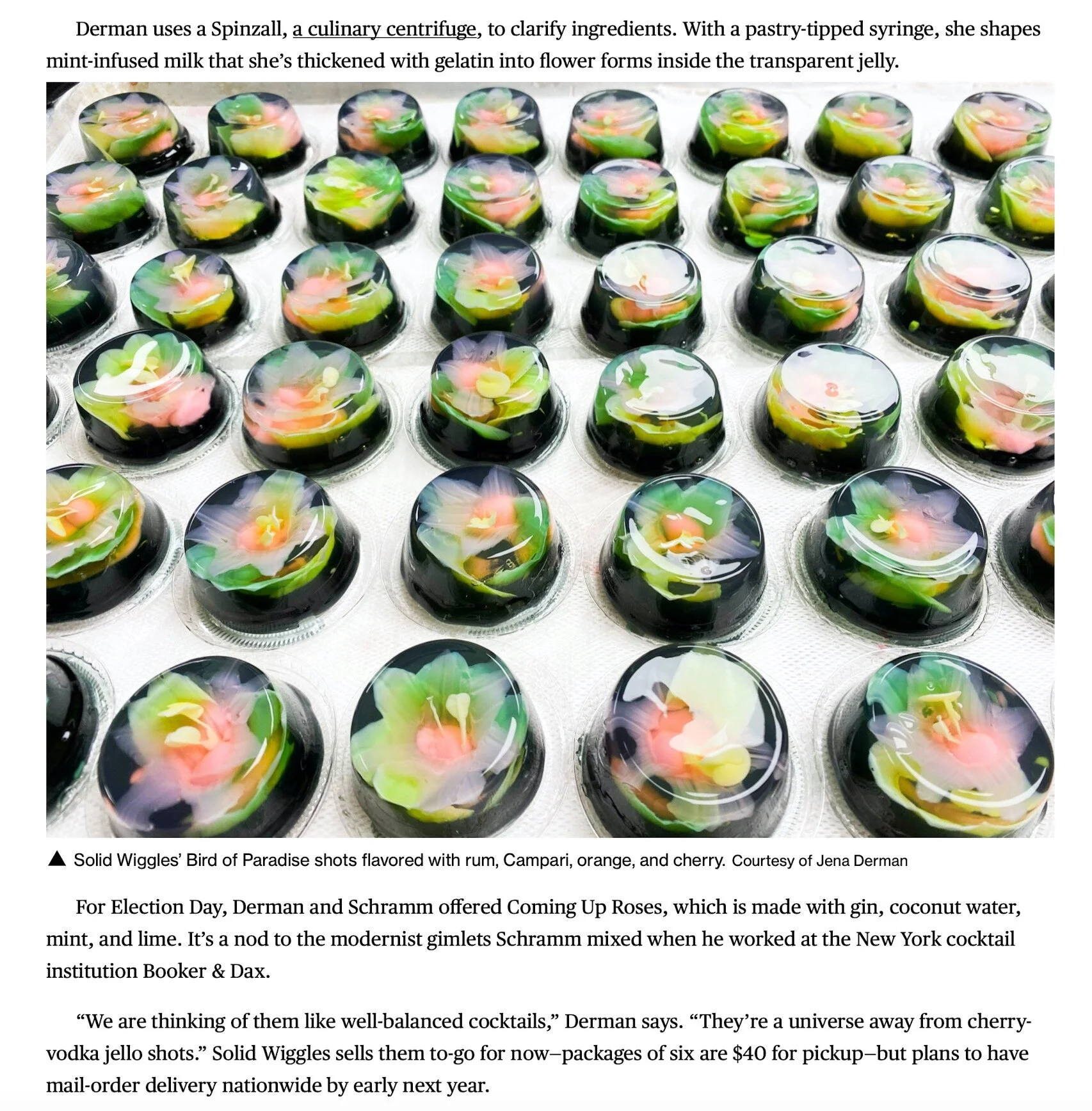 "No," she informed him, clear and concise. "You cannot just throw all my jello shots into a blender with some ice and make jello shot slushies. For one thing, I am sick of slushed beverages for probably at least a few more weeks, and for another thing, look at them. They're pieces of art. Do you really want to destroy my art?"